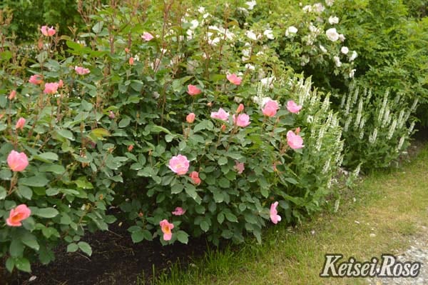 コーラルピンクに、中心が黄色となるユニークな花色。 蕾を覆う萼は柔らかく細かなとげに覆われ、蕾が割れると葉のような形になる姿も独特です。 シリーズの中で、樹形がよりコンパクトになります。 新梢は暗赤色で、次第に深緑色になります。 2007年AARS受賞